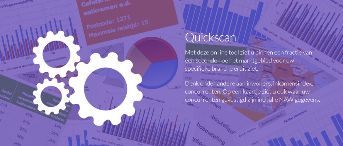 Met de Quickscan on line tool ziet u binnen een fractie van een seconde hoe het marktgebied voor uw specifieke branche eruit ziet. Denk onder andere aan inwoners, inkomensindex, concurrenten. Op een kaartje ziet u ook waar uw concurrenten gevestigd zijn incl. alle NAW gegevens. Ook zijn de bestedingen weergegeven binnen uw branche per postcodegebied. Dit alles overzichtelijk gepresenteerd in tabellen, landkaarten en staafdiagrammen.