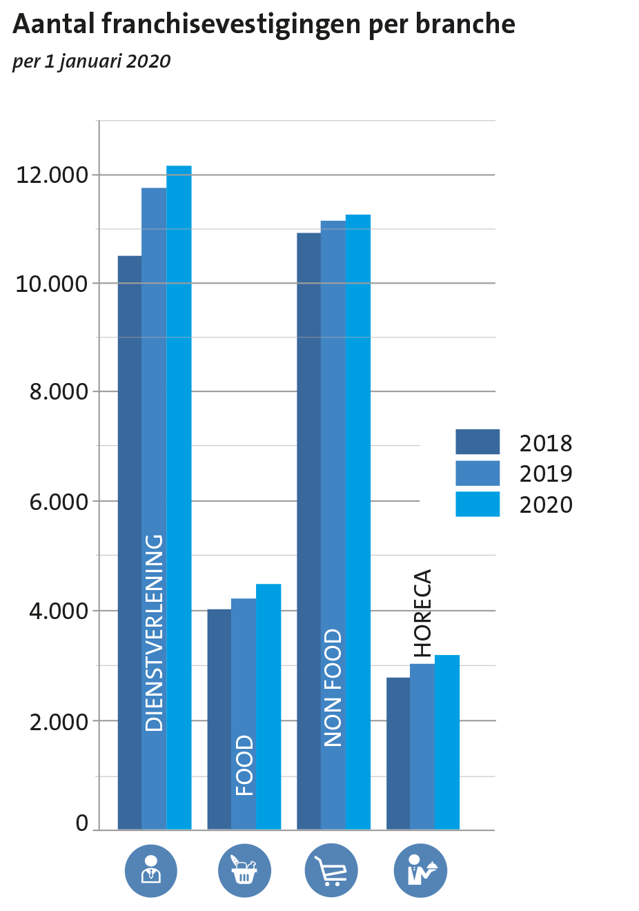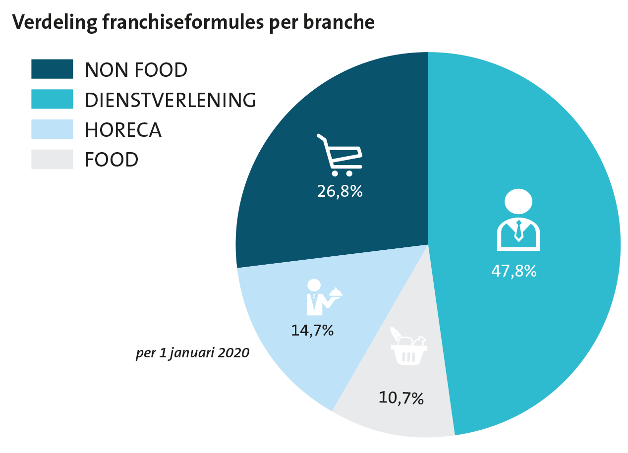 Het aantal franchisevestigingen is in 2019 toegenomen van 30.292 naar 31.046. Er zijn circa 355.100 personen werkzaam bij een franchiseformule. Het aantal franchiseformules nam toe van 772 in 2019 naar 784 in 2020.