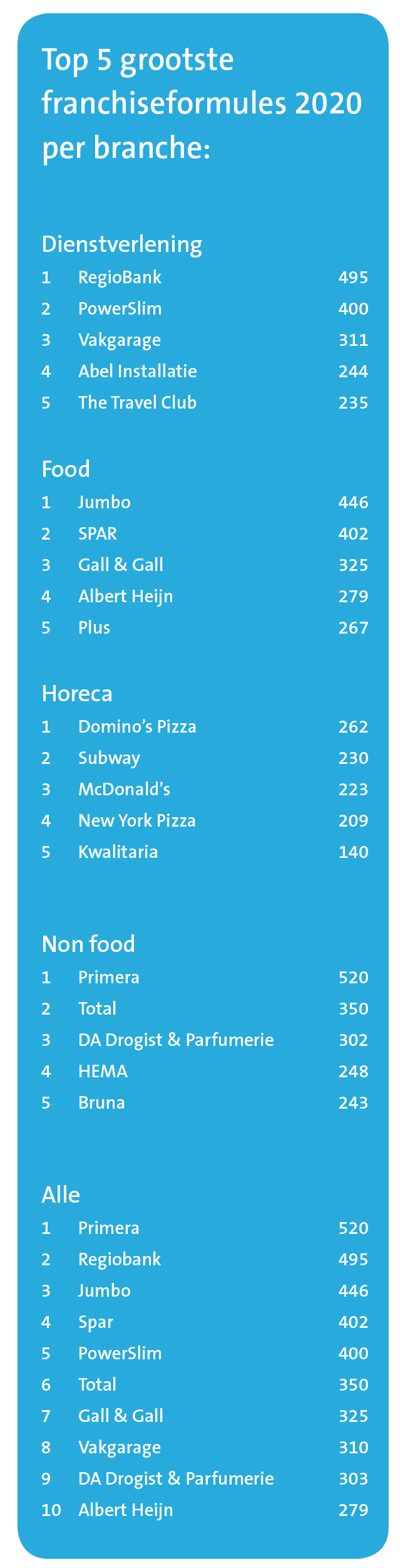 Er bevinden zich momenteel 210 franchiseformules in non-food, met iets meer dan 11.000 vestigingen. Het valt te bezien wat de effecten van de corona-crisis gaan zijn op deze cijfers. Die zijn nog niet bij deze aantallen inbegrepen. De eerste signalen uit de markt van vestigingen die permanent de deuren moeten