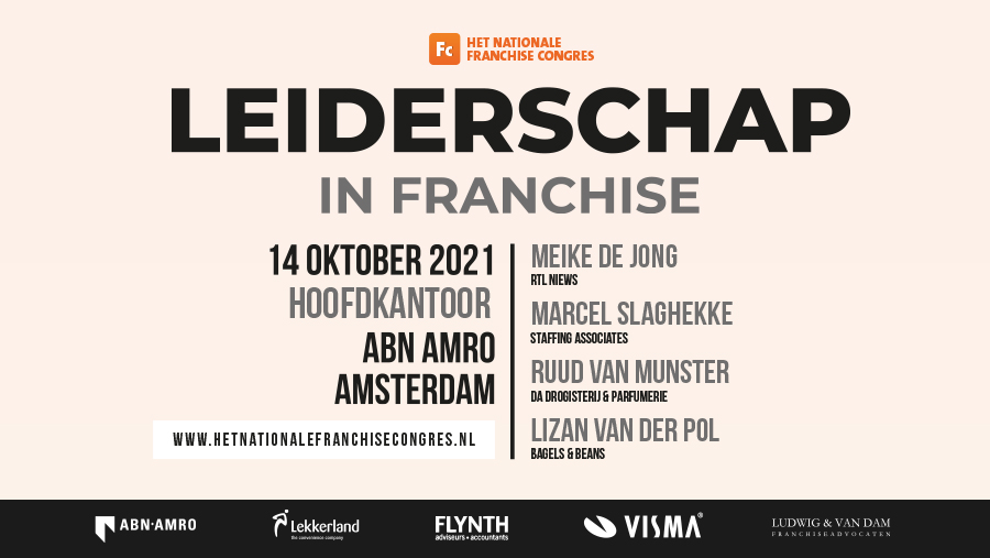 Op 14 oktober a.s. nemen we u mee in de 20e editie van Het Nationale Franchise Congres met dit jaar als thema “Leiderschap in Franchise”. Onder leiding van dagvoorzitter RTL presentatrice Meike de Jong vertellen dit jaar Ruud van Munster (Directeur DA Drogisterij & Parfumerie), Lizan van der Pol (Mede-eigenaar Bagels & Beans) en Marcel Slaghekke (Directeur Carrière Uitzendbureau en HappyNurse) over leiderschap in franchise.
