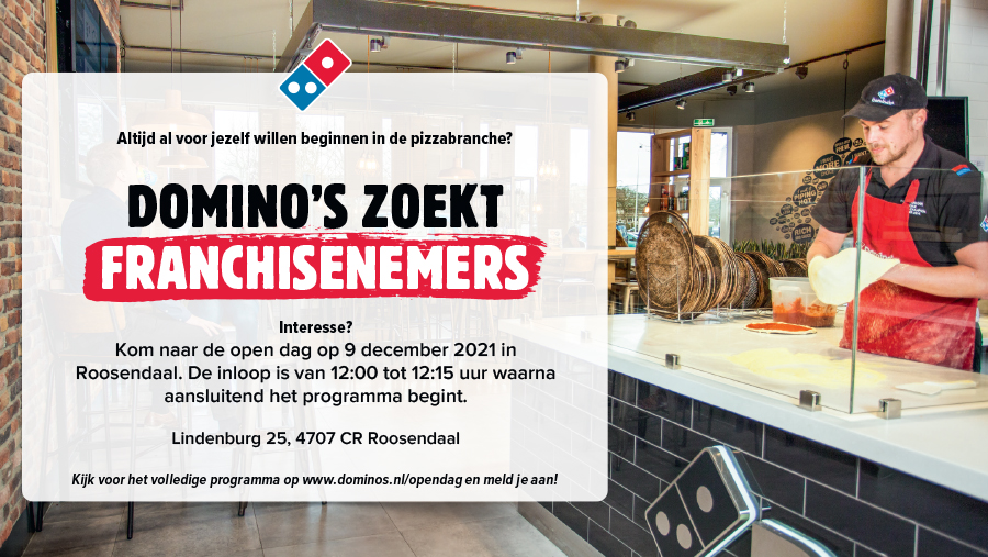 Op donderdag 9 december 2021 van 12.00 tot 15.00 uur is er een open dag in een vestiging van Domino’s, te weten Roosendaal aan de Lindenbrug 25. Diverse facetten van franchising bij Domino’s zullen die dag de revue passeren. Dus overweeg jij het om de stap te maken, maar ben je er nog niet helemaal uit? Meld je dan aan via dit formulier!