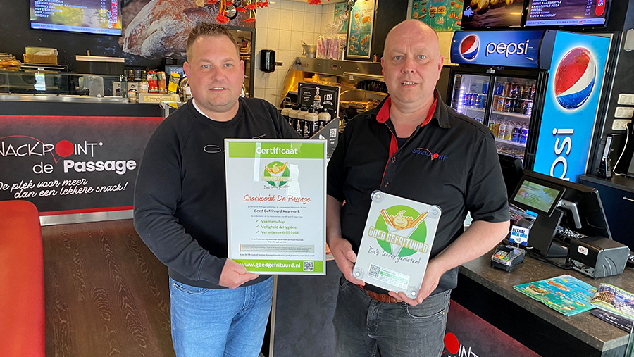 ProFri-bestuurslid Marcel van Veen (links op de foto) heeft dinsdag het keurmerk Goed Gefrituurd Keurmerk uitgereikt aan zijn collega Menno de Koe van Snackpoint de Passage in het Friese Wolvega. De vakvereniging was in De Koe’s bedrijf te gast vanwege een regionale ledenbijeenkomst.